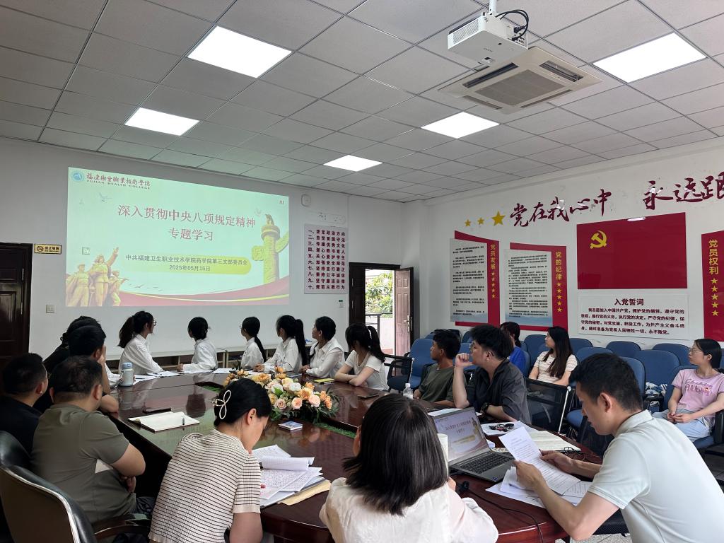 5月15日,藥學(xué)院第三黨支部組織全體黨員開展深入貫徹中央八項(xiàng)規(guī)定精神學(xué)習(xí)教育第二次專題學(xué)習(xí),聚焦中央八項(xiàng)規(guī)定中 “精簡(jiǎn)會(huì)議活動(dòng)”“精簡(jiǎn)文件簡(jiǎn)報(bào)”兩條核心內(nèi)容開展專題學(xué)習(xí)與研討,切實(shí)推進(jìn)作風(fēng)建設(shè)常態(tài)化、長(zhǎng)效化。