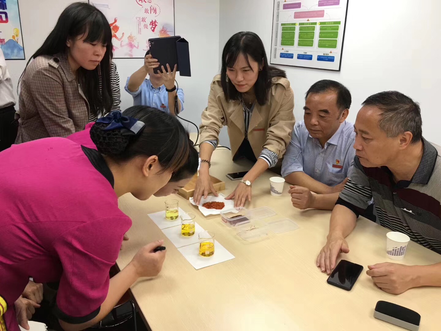 “大家看這兩個燒杯,里面分別是兩種西紅花泡水后呈現(xiàn)的顏色,哪個是正品?哪個是偽劣?”支部組織委員、執(zhí)業(yè)中藥師陳鈺博士提出的問題讓同仁堂的員工陷入了思考,面對眼前的兩種西紅花實物與兩個幾乎相同的黃色液體,片刻沉寂之后,大家馬上行動了起來,手摸,鼻聞,仔細端詳?shù)囊后w樣品,忙得不亦樂乎。最后陳鈺老師揭曉答案,店員們恍然大悟,感嘆當下造假技術高明的同時,也增長了見識,更對自己從事工作在保障人民安全用藥方面的重要性有了進一步的認識。