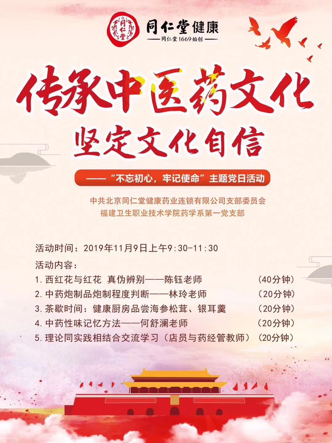 11月9日,一場別開生面的主題黨日活動在北京同仁堂福建藥業(yè)連鎖有限公司福州南星商城藥店拉開帷幕。本次黨日活動的主題是“傳承中醫(yī)藥文化,堅定文化自信”,學院紀委游鋒書記和藥學系黨總支鄭力宏書記蒞臨現(xiàn)場,藥學系第一黨支部全體黨員、北京同仁堂福建藥業(yè)連鎖有限公司的黨員代表和一線員工到場參加。