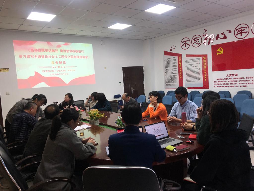 20211216日,藥學(xué)院第一黨支部書記何舒瀾在藥學(xué)院會議室為支部黨員開展福建省第十一次黨代會精神專題黨課。