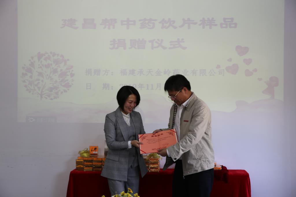 捐贈儀式上,福建承天金嶺藥業(yè)有限公司代表謝瑞華副總經(jīng)理向我校捐贈“建昌幫”中藥炮制標(biāo)本100份,蘇友新校長為謝瑞華副總經(jīng)理頒發(fā)了捐贈證書。