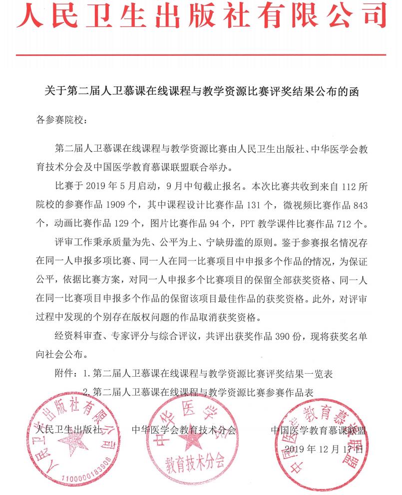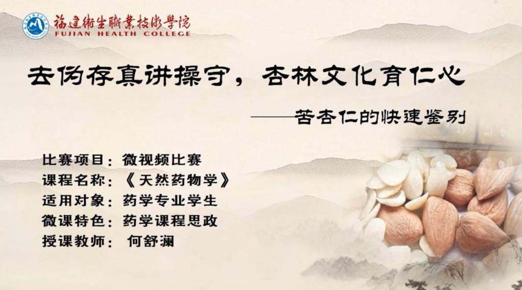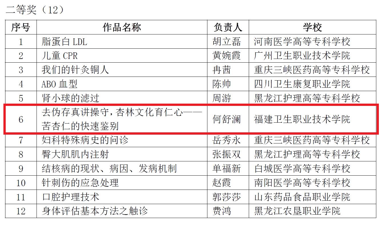 第二屆人衛(wèi)慕課在線課程與教學(xué)資源比賽由人民衛(wèi)生出版社、中華醫(yī)學(xué)會(huì)教育技術(shù)分會(huì)及中國(guó)醫(yī)學(xué)教育慕課聯(lián)盟聯(lián)合舉辦。本次比賽于2019年5月啟動(dòng),9月中旬截止報(bào)名,共收到微視頻作品843個(gè)。12月17日人衛(wèi)慕課官網(wǎng)公布評(píng)獎(jiǎng)結(jié)果,中高職組共有36個(gè)微視頻獲獎(jiǎng),藥學(xué)系何舒瀾、林玲、陳鈺三位老師的作品《去偽存真講操守,杏林文化育仁心——苦杏仁的快速鑒別》在眾多作品中脫穎而出,榮獲二等獎(jiǎng)。