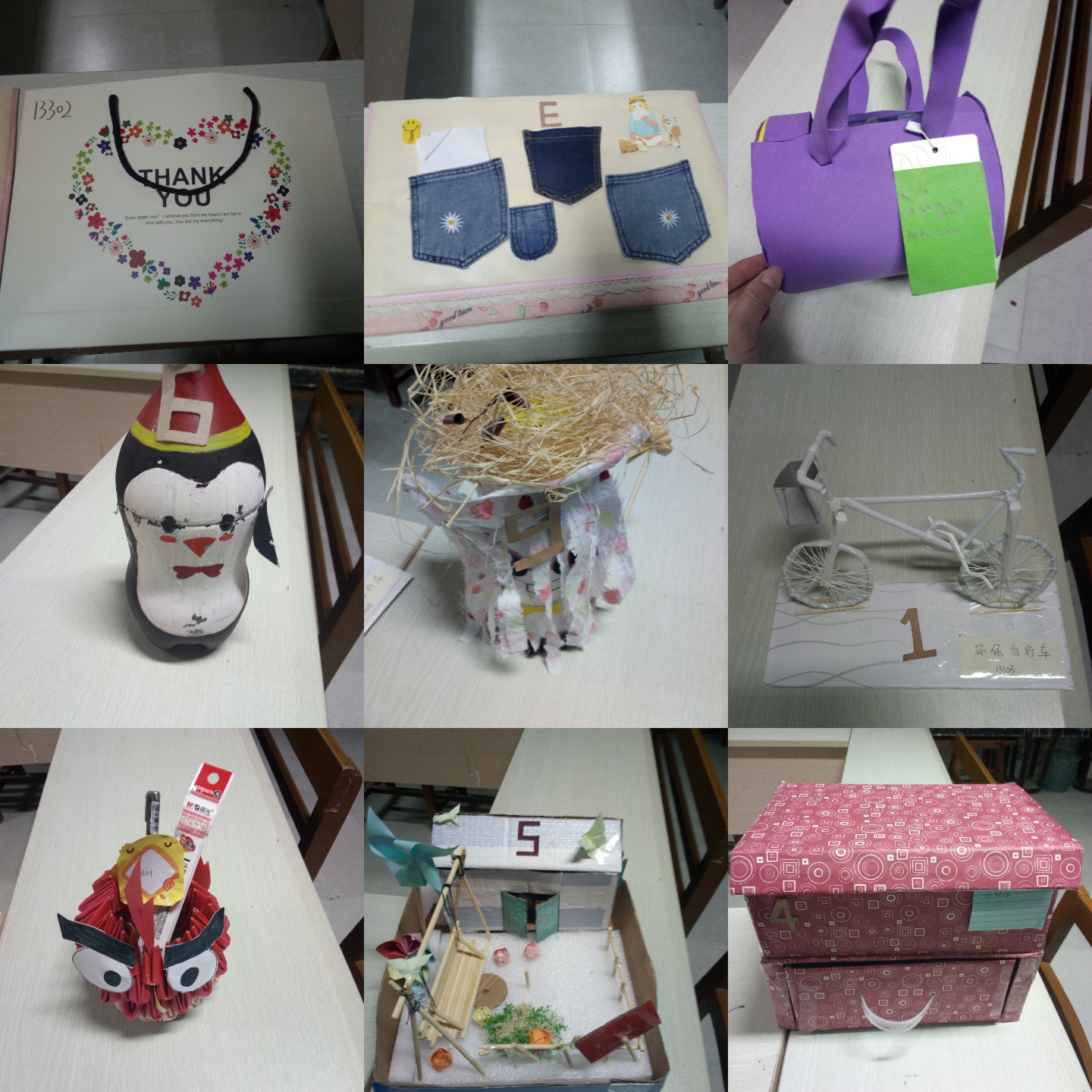 個性的造型、環(huán)保的利用、溫馨的裝飾、五花八門的創(chuàng)意在我系學(xué)生作品中展現(xiàn)的淋漓盡致。各個作品獨具特色,精致的創(chuàng)意手工吊燈、俏皮可愛的企鵝寶寶、美觀實用的儲物盒展現(xiàn)了同學(xué)們的動手能力、環(huán)保意識,以及參與系部活動的積極性。最終,評委根據(jù)評分標(biāo)準(zhǔn)對各作品進行打分,最終13502宿舍以獨特的造型和環(huán)保的理念獲得一等獎;10304、13302宿舍以巧妙的構(gòu)思獲得二等獎;三等獎分別花落13503、1360113402宿舍;獲得優(yōu)秀獎的宿舍分別為102041050413301;而10104則斬獲了最佳創(chuàng)意獎。