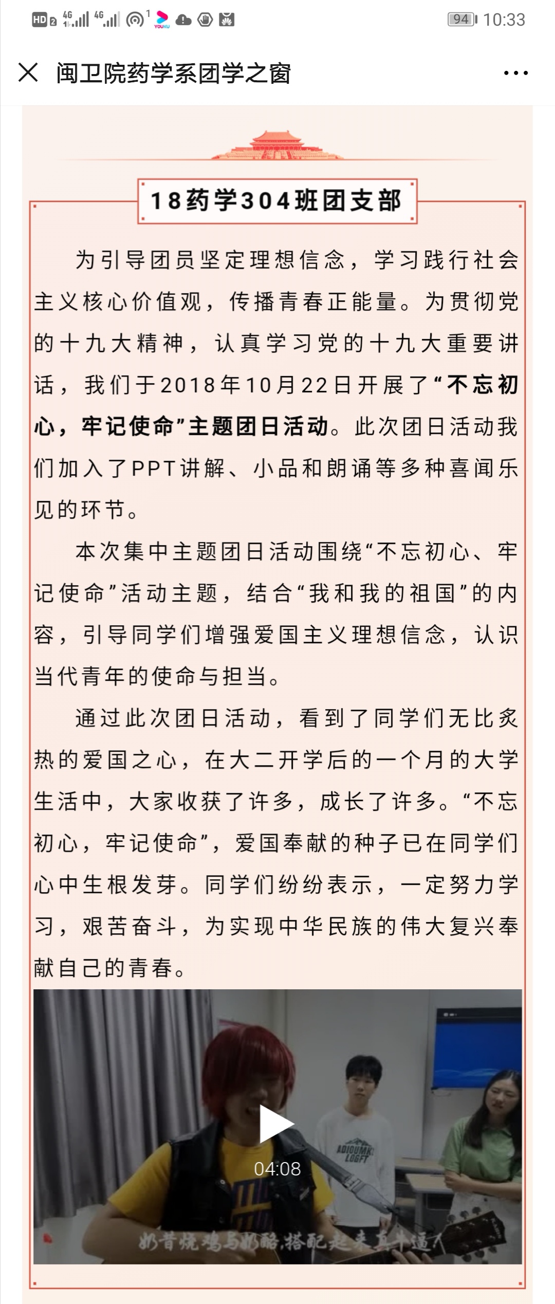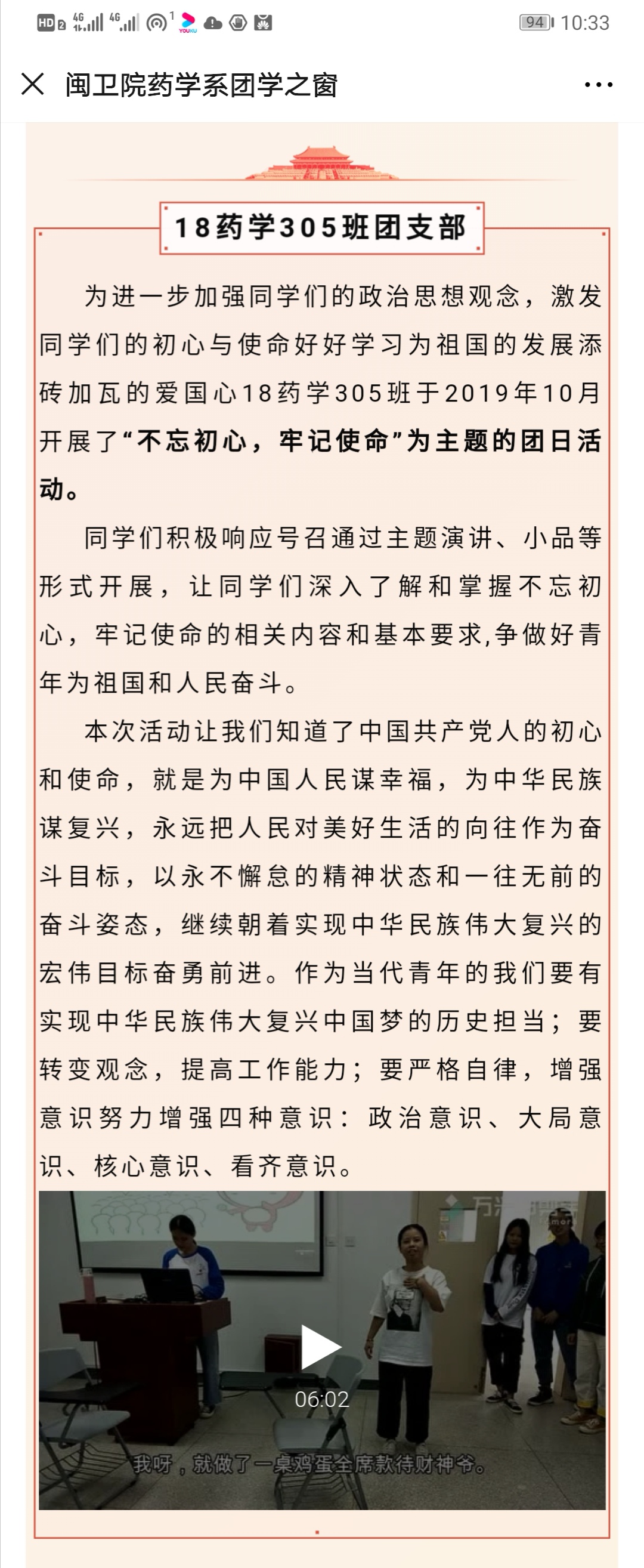 為進一步推進從嚴(yán)治團,激發(fā)基層團支部活力,發(fā)揮主題團日活動在青年學(xué)生中思想引領(lǐng)、價值引領(lǐng)作用,促進主題團日活動制度化、規(guī)范化,增強基層團組織的凝聚力、影響力,藥學(xué)系于2019年10月開展了以“不忘初心、牢記使命”為主題的團日活動。