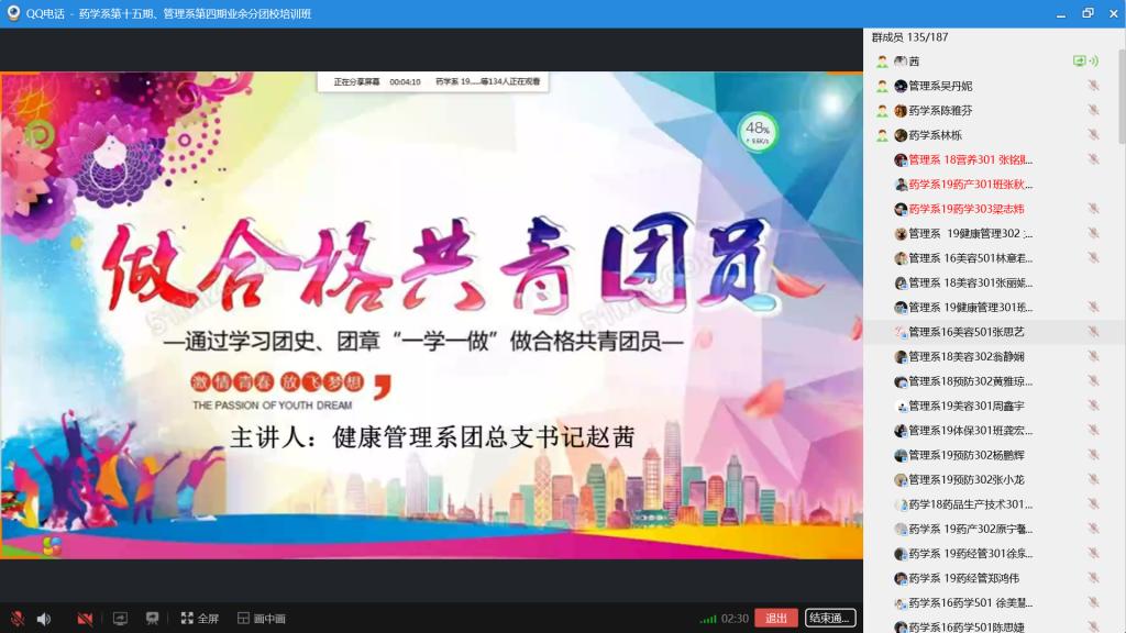 2020年312日,為提升廣大青年團員醫(yī)學生的綜合素質,健康管理系團總支書記趙茜老師為藥學系第十五期、管理系第四期業(yè)余分團校的學員們講授主題為“做合格共青團員”專題團課。