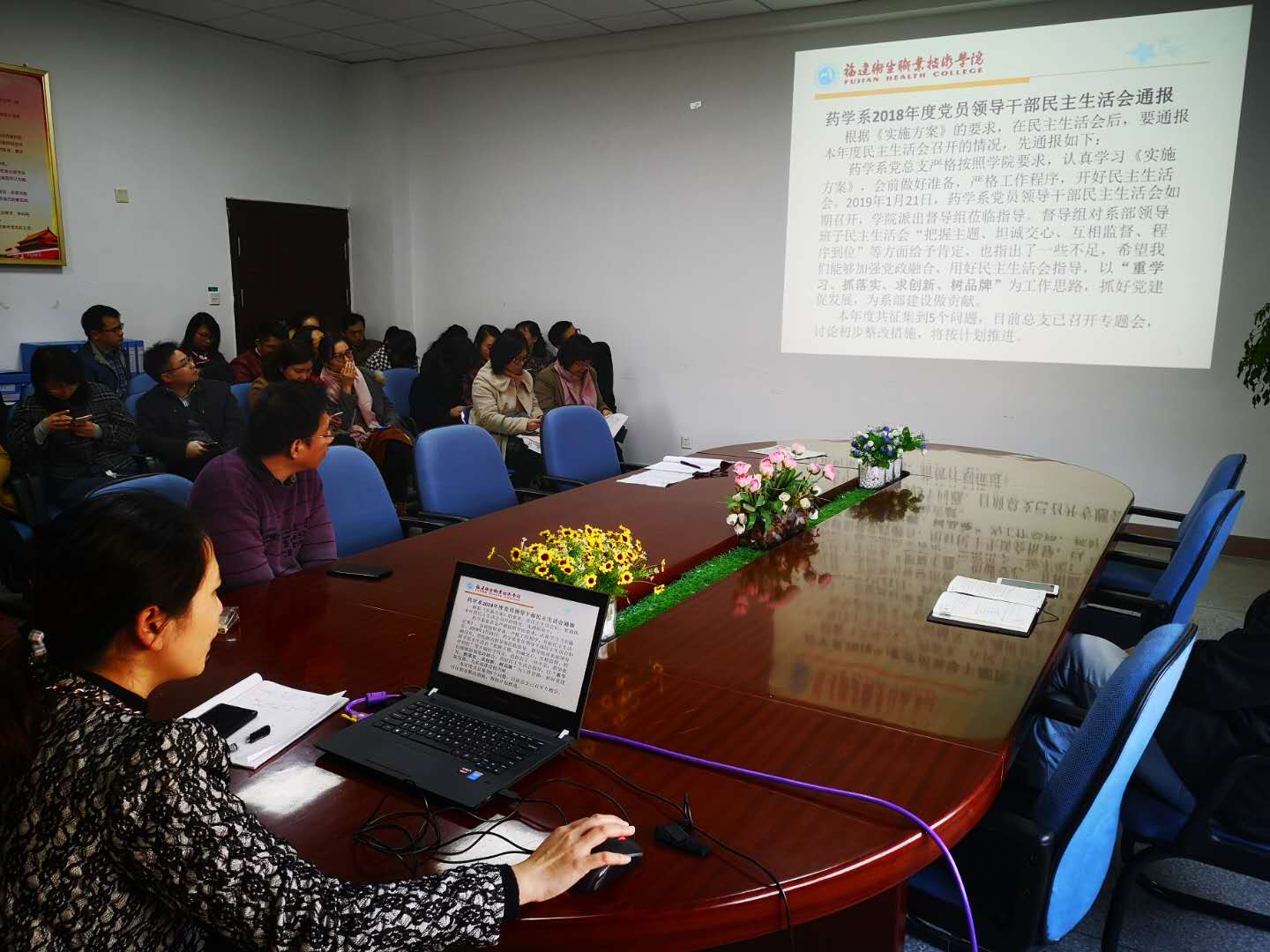 1月24日,藥學系召開全體教職工大會,對2018年度藥學系黨員領導干部民主生活會的情況進行通報,會議由陳潔副書記主持。