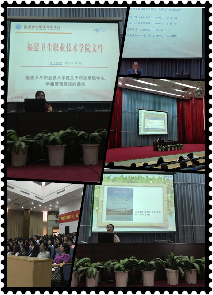 我系潘雪豐副首先為同學(xué)們播放學(xué)院宣傳片,讓大家對學(xué)院的歷史、學(xué)院的概況有了直觀的認(rèn)識,隨后結(jié)合系部的實(shí)際為新生了介紹了專業(yè)學(xué)習(xí)和專業(yè)前景。陳潔副書記則為新生進(jìn)行了紀(jì)律教育,從為什么要遵守紀(jì)律、遵紀(jì)守法對我們的影響等幾個(gè)方面強(qiáng)調(diào)學(xué)生必須遵守的各項(xiàng)規(guī)章制度,同時(shí)要求“千禧一代”的學(xué)生要認(rèn)真學(xué)習(xí)習(xí)近平新時(shí)代中國特色社會主義思想,引導(dǎo)學(xué)生樹立崇高理想,誓為健康護(hù)航。圖書館張麗萍老師、保衛(wèi)處葛能杰老師還分別為同學(xué)們介紹了圖書館的借書流程、書本檢索知識、防火、防盜、防欺凌、防詐騙、防校園貸等校園安全知識等,幫助學(xué)生樹立正確的校園安全觀。