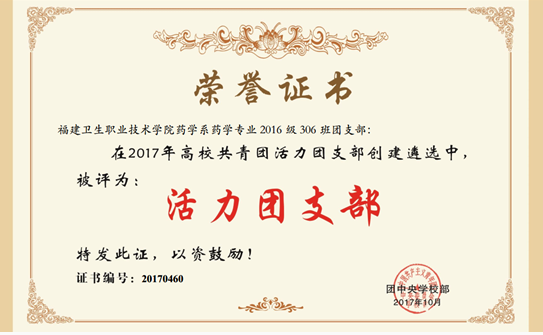 據(jù)悉,為貫徹落實《高校共青團改革實施方案》有關(guān)精神,深入實施高?;鶎訄F支部“活力提升”工程,團中央學(xué)校部于2017年10月開展高校“活力團支部”創(chuàng)建遴選活動,主要面向全國各高校的學(xué)生團支部(總支)。經(jīng)校內(nèi)創(chuàng)建、省級遴選、網(wǎng)絡(luò)投票、專家評審和公示等環(huán)節(jié),共確定1000個團支部為2017年全國高?!盎盍F支部”。福建省共入選35個團支部,其中本科高校32個,高職院校3個。我系16藥學(xué)306班團支部憑借自身實力成功入選。