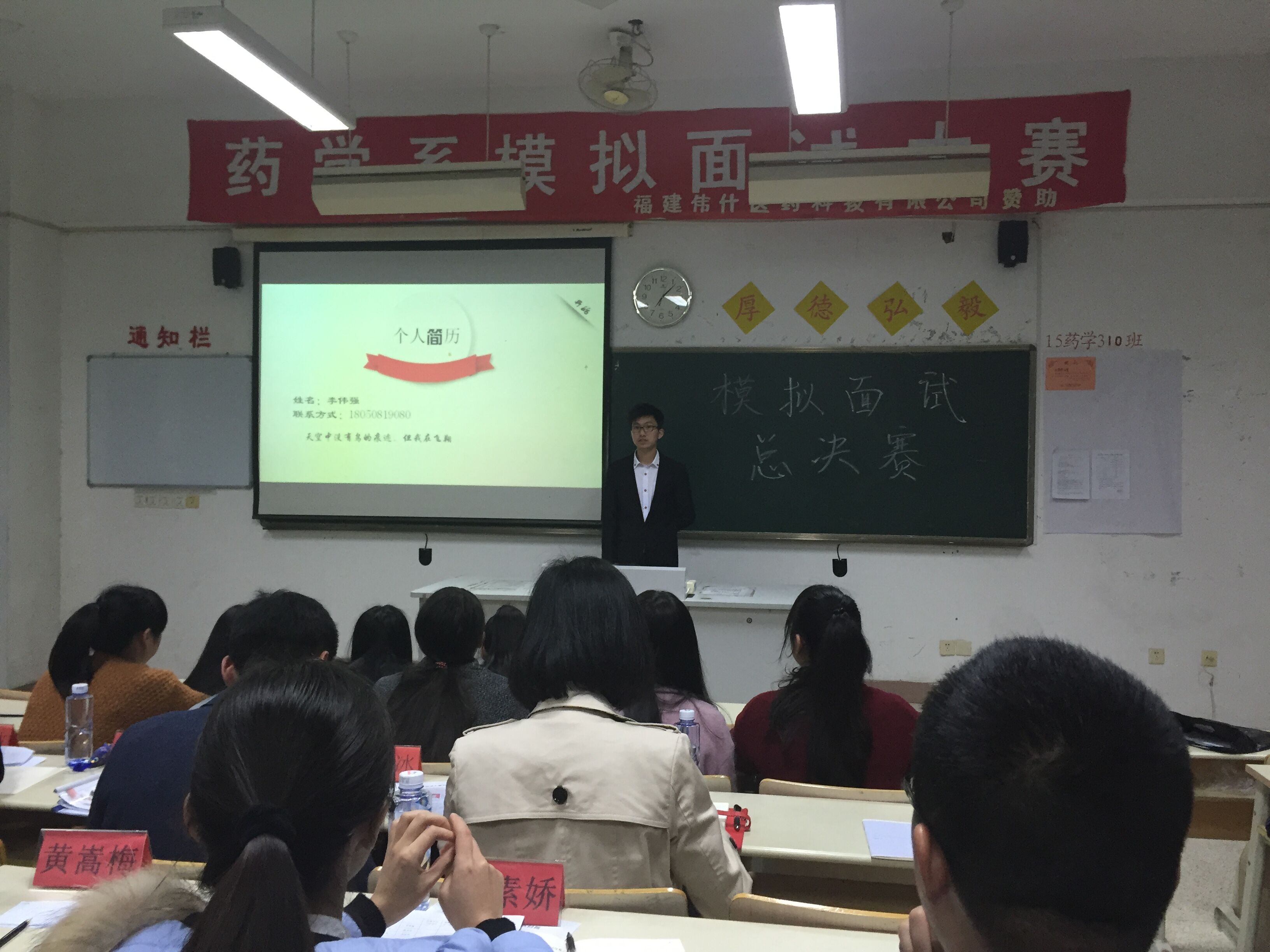 藥學(xué)系于3月29日晚在教學(xué)樓215教室舉辦模擬面試大賽總決賽。為更好地模擬醫(yī)藥企業(yè)面試場(chǎng)景,本次大賽特邀葛蘭素史克公司銷售大區(qū)經(jīng)理張少波先生,輝瑞公司銷售主管劉楚先生以及福建偉什醫(yī)藥科技有限公司人事經(jīng)理池化冰先生、HR專員鄭彬焮學(xué)姐到場(chǎng)擔(dān)任評(píng)委,藥學(xué)系蘇愛華書記及各輔導(dǎo)員們應(yīng)邀出席。