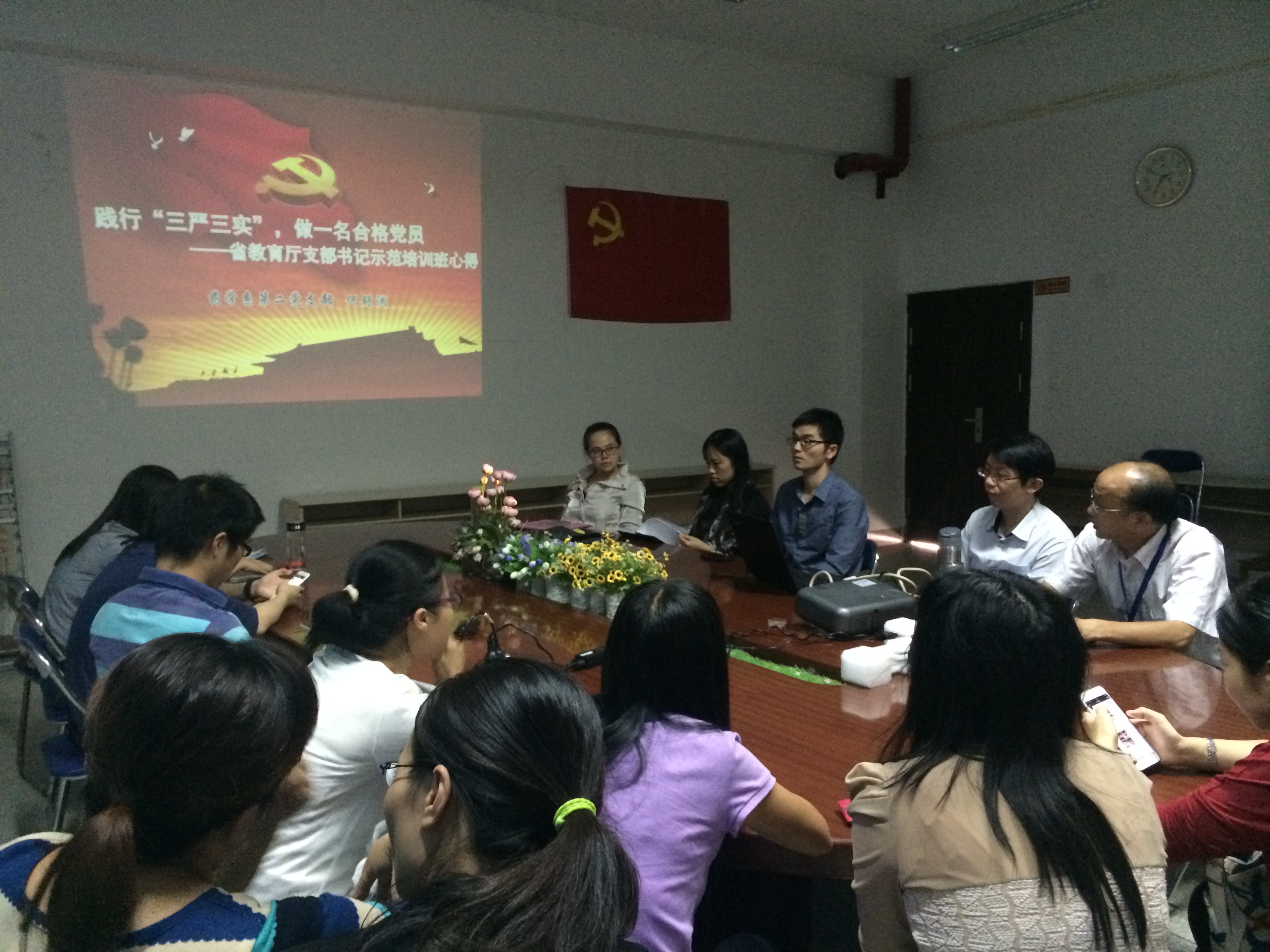 何舒瀾同志結(jié)合九月份參加省教育廳支部書(shū)記示范培訓(xùn)班的學(xué)習(xí)體會(huì),以《踐行“三嚴(yán)三實(shí)”,做一名合格的共產(chǎn)黨員》為題,圍繞著“‘三嚴(yán)三實(shí)’的基本內(nèi)涵、當(dāng)前工作中存在的‘不嚴(yán)不實(shí)’問(wèn)題;以及如何做一名合格的共產(chǎn)黨員”等三個(gè)方面進(jìn)行了講解和分析。全體黨員都認(rèn)真聽(tīng)講并做好筆記。