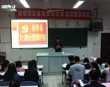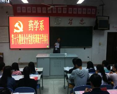 2015 11 12 下午 3 40 分,藥學系于系部一階教室隆重舉行第十六期業(yè)余分黨課開班典禮,蒞位本次大會的領導以及老師有藥學系黨總支書記蘇愛華老師,藥學系黨總支副書記林浩老師,藥學系第二黨支部書記何舒瀾老師,藥學系第三黨支部書記陳瑜老師,藥學系團總支書記李寶珠老師,以及藥學系的各位輔導員們。
