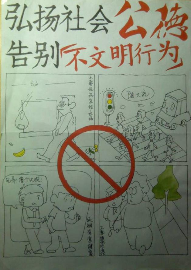 一幅幅生機盎然、既美觀又富有深刻含義的漫畫提醒同學們時時刻刻注意自己的一言一行,讓‘不文明行為’無處藏身,讓青春校園遍種文明之花!