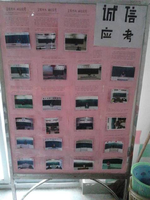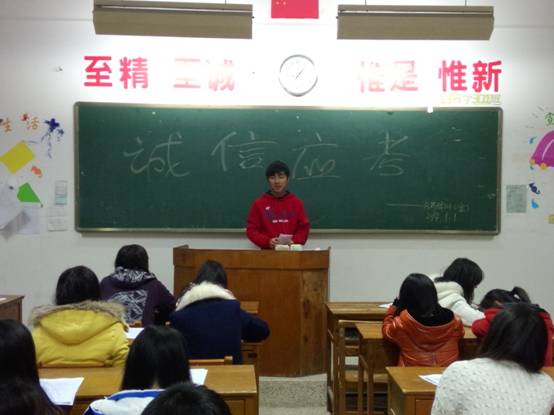 班會伊始,各班負責人引用名人名言和經典案例強調了誠信的重要性,讓同學們對“誠信應考”有深刻的認識。其后,各班學習委員組織同學們共同學習學生手冊中關于考試紀律的規(guī)章制度,強調考試過程中需要注意的事項及考風考紀問題,并讓班上學習成績較好的同學分享相關的學習方法和復習方案。再次,班級的各班委上臺就誠信應考再次作了強調,并承諾以身作則,做好帶頭作用。最后,各班同學共同宣誓“實事求是,信守承諾;認真學習,誠信應考;手握誠信,把握未來”,積極進行了“誠信應考”簽字承諾,表示要下定決心,努力復習,在期末考試中展現(xiàn)自己真正的實力。