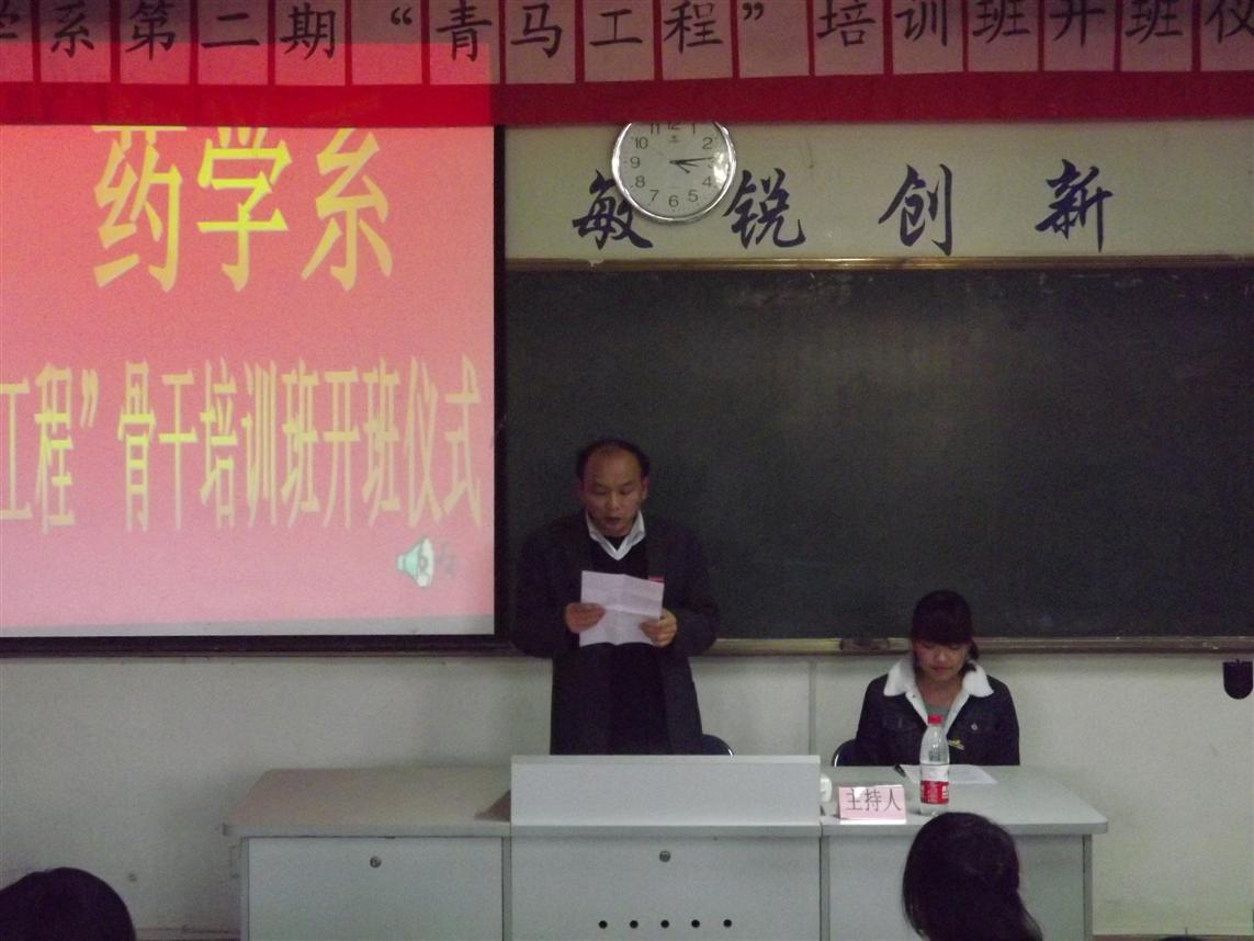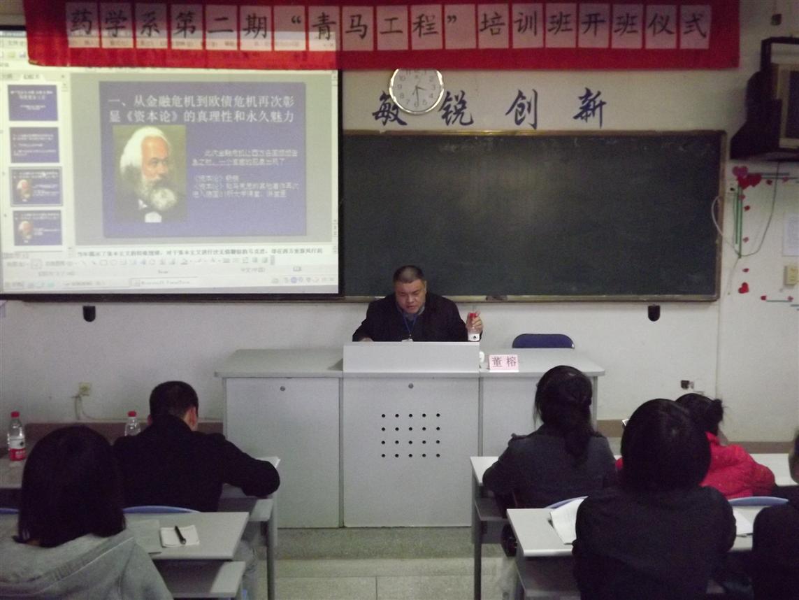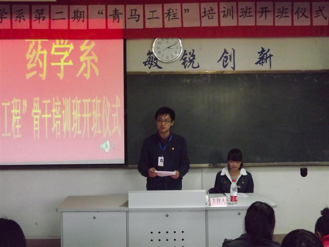 開班儀式在莊嚴的國歌中拉開了序幕。首先系團總支書記王鈍銳老師宣讀第二期青馬工程培訓班學員名單和“青馬工程”培訓班守則,并希望同學們能夠自覺遵守;接著,學員代表鄭彬焮同學發(fā)言,她號召廣大學員珍惜此次的學習機會,做一名名副其實的青年馬克思主義者和為同學服務的學生干部;接著,院團委宋維書記希望全體學員能夠深刻理解科學發(fā)展觀和社會主義核心價值體系的科學內(nèi)涵,并用到現(xiàn)實的學習和生活中。最后,藥學系黨總支蘇愛華書記做重要講話,他希望全體學員加強自身的思想教育,不斷提高自身的素質(zhì),在同學中起模范作用。
