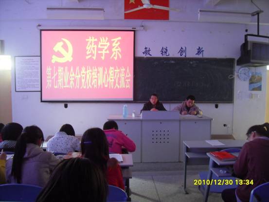 藥學系第七期業(yè)余分黨校培訓心得交流會于12月30日中午在藥學系第一階梯教室舉行,交流會由系團總支副書記王鈍銳老師主持,系黨總支歐春木書記出席了本次交流會。