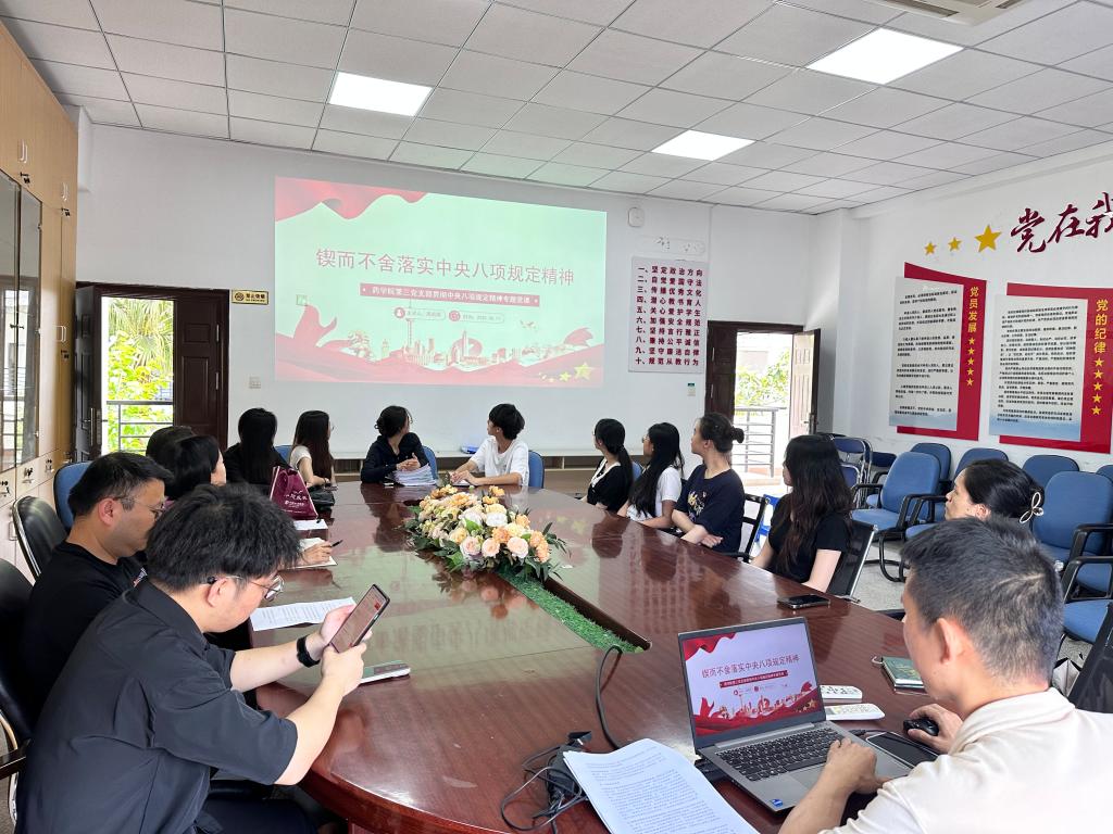為深入貫徹中央八項(xiàng)規(guī)定精神,持續(xù)推進(jìn)作風(fēng)建設(shè)走深走實(shí),藥學(xué)院第三黨支部于6月11日組織開(kāi)展 “鍥而不舍落實(shí)中央八項(xiàng)規(guī)定精神” 專(zhuān)題黨課。支部全體黨員通過(guò)系統(tǒng)學(xué)習(xí)歷史脈絡(luò)、寶貴經(jīng)驗(yàn)與實(shí)踐要求,進(jìn)一步筑牢紀(jì)律防線,以理論清醒推動(dòng)行動(dòng)自覺(jué)。同時(shí),會(huì)上傳達(dá)了全省警示教育會(huì)精神。