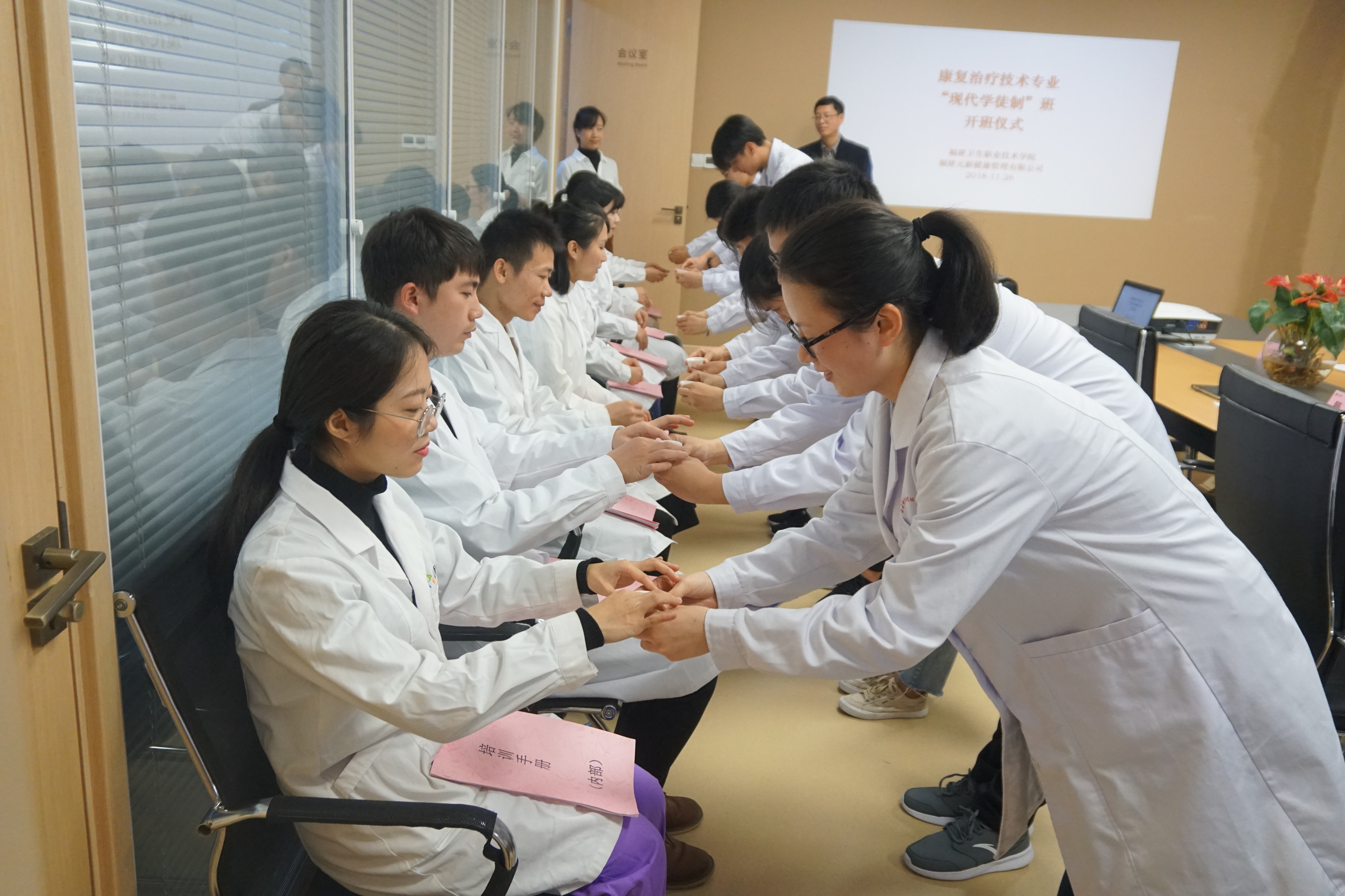 11月26日,福建衛(wèi)生職業(yè)技術(shù)學(xué)院與福建元新健康管理有限公司聯(lián)合開辦的2017級康復(fù)治療技術(shù)“學(xué)徒制”班開班儀式暨“拜師儀式”在福建元新健康管理有限公司舉行。我院黃銘珊副院長、教務(wù)處朱扶蓉處長、臨床醫(yī)學(xué)系郭禮堅主任、福建元新健康管理公司陳鋒總裁、醫(yī)務(wù)部的范世垚主任、企業(yè)導(dǎo)師團(tuán)隊、我院康復(fù)教研室全體教師以及17康復(fù)治療技術(shù)301班全體同學(xué)共同出席了本次 開班儀式。