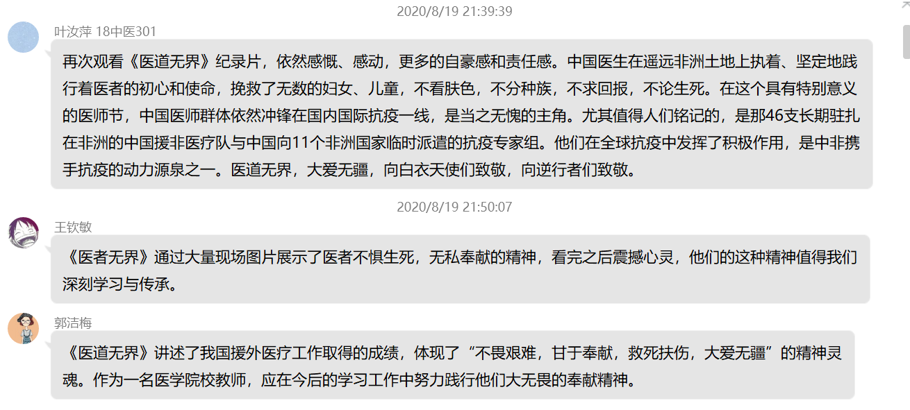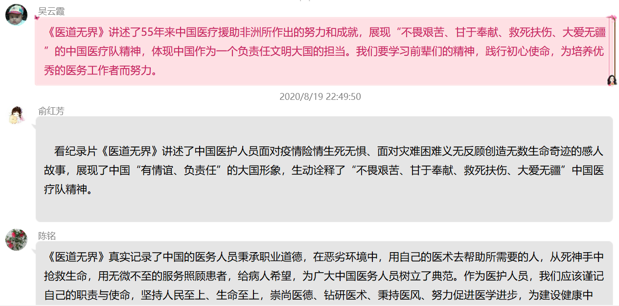 觀看之后,黨員紛紛發(fā)表感言,《醫(yī)道無界》體現(xiàn)了中國援外醫(yī)護人員不畏艱難、甘于奉獻、救死扶傷、大愛無疆的精神。我們作為醫(yī)學(xué)院校黨員教師,更應(yīng)在今后的工作中努力踐行和弘揚這種大無畏的奉獻精神。在這個具有特別意義的醫(yī)師節(jié),中國醫(yī)師群體依然沖鋒在國內(nèi)國際抗疫一線,醫(yī)道無界、大愛無疆,向白衣天使們致敬,向逆行者們致敬。