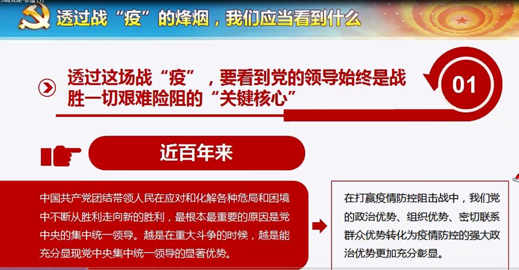 課間,黨員們也各抒己見,從這場(chǎng)“新冠肺炎”疫情的大考大戰(zhàn)面前,黨中央的堅(jiān)強(qiáng)領(lǐng)導(dǎo)和各級(jí)政府的高效應(yīng)急處置能力使這場(chǎng)總體戰(zhàn)、阻擊戰(zhàn)戰(zhàn)果顯著,讓我們備受鼓舞、信心滿懷。一方有難,八方支援,這場(chǎng)戰(zhàn)疫處處體現(xiàn)了中國(guó)集中力量辦大事的制度優(yōu)勢(shì)。這場(chǎng)疫情是一筆寶貴的財(cái)富,促使我們警醒、改變、奮進(jìn),使強(qiáng)國(guó)強(qiáng)軍在全國(guó)上下已在形成更廣泛的共識(shí)、更自覺的行動(dòng)。