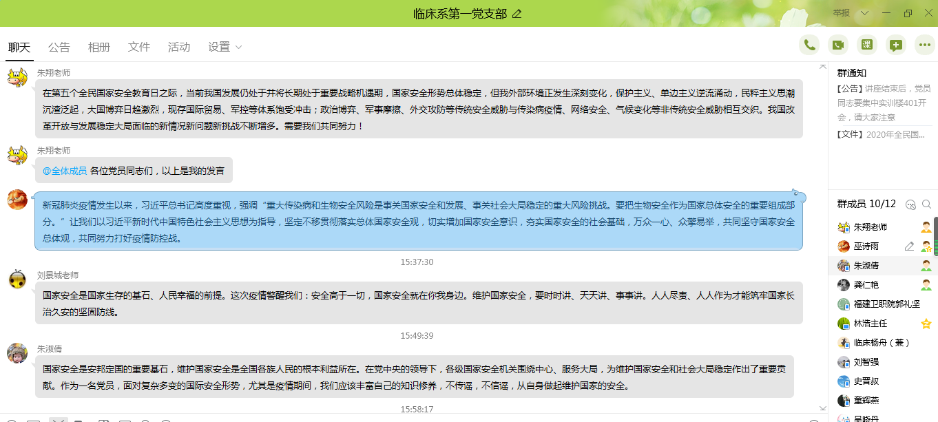 今年4月15日是第5個全民國家安全教育日,今年的主題是“堅持總體國家安全觀,統(tǒng)籌傳統(tǒng)安全和非傳統(tǒng)安全,為決勝全面建成小康社會提供堅強(qiáng)保障”。為深入學(xué)習(xí)理解習(xí)近平總書記提出的“總體國家安全觀”,提高全員維護(hù)國家安全的意識。4月15日,臨床系第一黨支部開展“國家安全教育日”主題黨日活動,此次活動由支部書記朱翔同志主持,支部全體黨員參加。