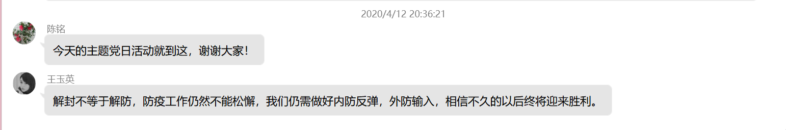 通過(guò)認(rèn)真學(xué)習(xí),與會(huì)的黨員同志們紛紛表示,武漢解封受到全國(guó)甚至全世界人民的矚目。如今的相對(duì)安寧,是全中國(guó)人民歷經(jīng)2個(gè)多月的不懈努力,是數(shù)不清的英雄犧牲幸福、團(tuán)圓、健康甚至生命換來(lái)的,我們要珍惜這來(lái)之不易的成果。雖然武漢已經(jīng)解封,全國(guó)陸續(xù)復(fù)工復(fù)產(chǎn),但是疫情還沒(méi)有解除,我們?nèi)圆荒芊潘删瑁砸懈叨鹊姆揽匾庾R(shí),不獲全勝?zèng)Q不輕言成功!不獲全勝絕不放松。鄭翠紅副校長(zhǎng)還指出,作為黨員教師,我們一定要杜絕懈怠的工作狀態(tài),堅(jiān)持外防輸入、內(nèi)防反彈,認(rèn)真做好開(kāi)學(xué)前的準(zhǔn)備工作。