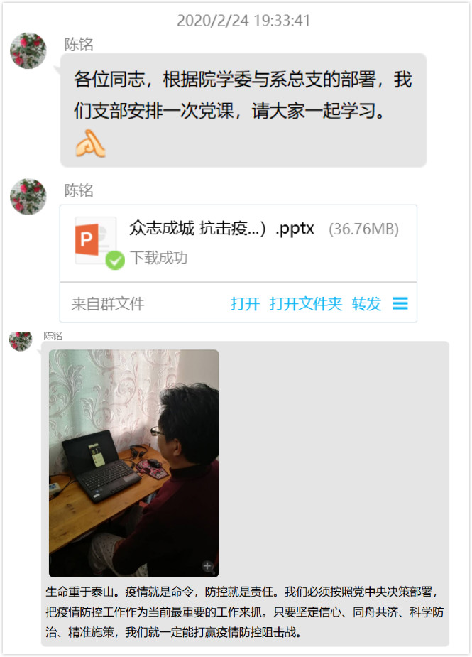 黨課之后,支部黨員還就今天觀看的復(fù)旦大學(xué)“新冠肺炎防控第一課”進(jìn)行了熱烈的討論,黨員們紛紛表示,通過學(xué)習(xí)張文宏和吳凡老師精彩課程之后,更進(jìn)一步了解“新冠肺炎”,也更能充分認(rèn)識到當(dāng)前疫情防控工作的重要性。針對校園疫情防控工作,作為一名黨員,我們更應(yīng)該科學(xué)地、積極的引導(dǎo)學(xué)生全面學(xué)習(xí)疫情防控知識,積極的投入到疫情防控突擊隊(duì)的各項(xiàng)工作中!