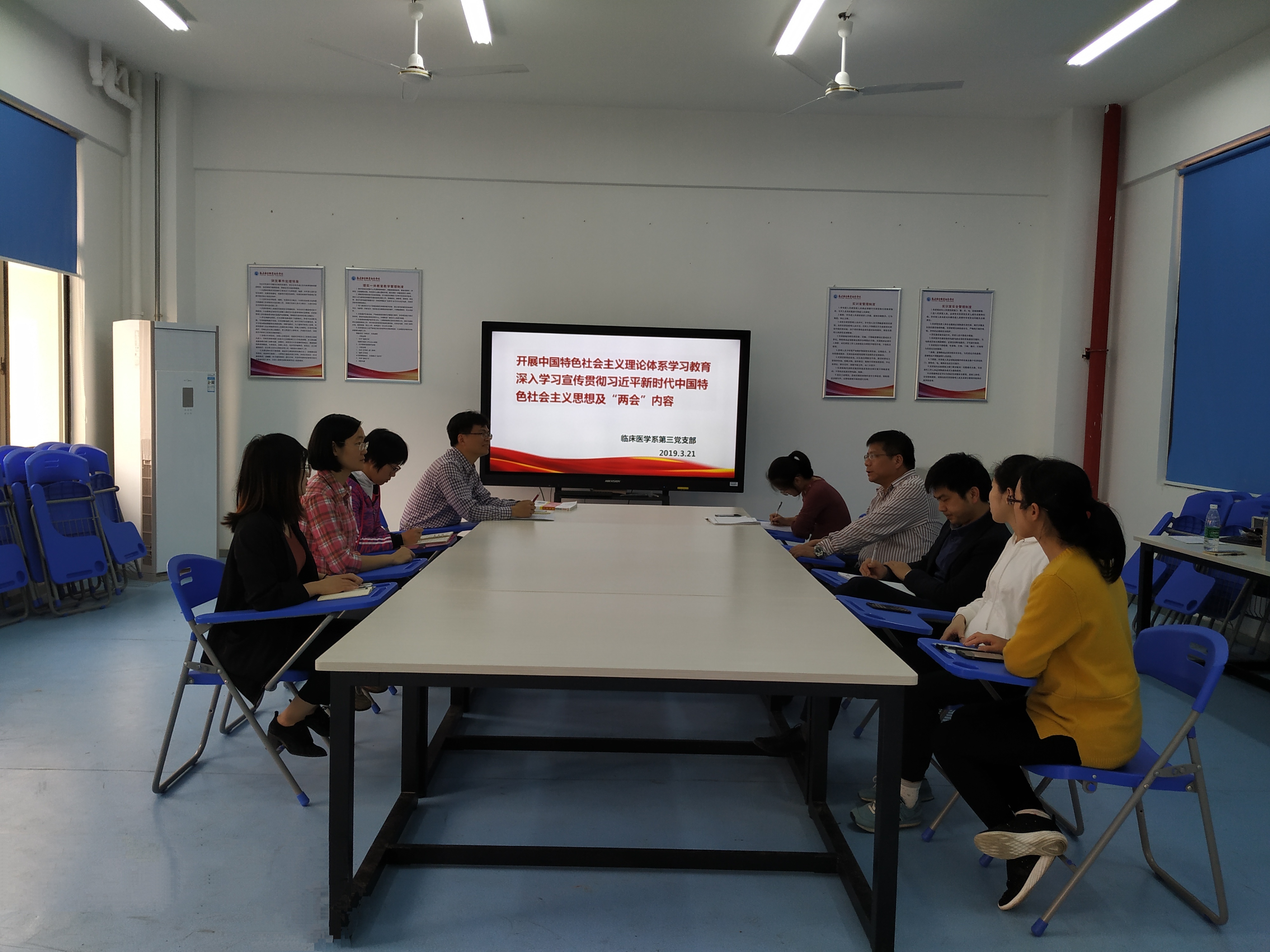為進(jìn)一步深入學(xué)習(xí)宣傳貫徹習(xí)近平新時(shí)代中國特色社會(huì)主義思想,開展中國特色社會(huì)主義理論體系學(xué)習(xí)教育。臨床醫(yī)學(xué)系第三黨支部于2019年3月21日召開黨員大會(huì),組織支部全體黨員認(rèn)真學(xué)習(xí)貫徹全國兩會(huì)的重要精神。支部書記陳銘同志主持會(huì)議并首先向大家介紹了這次兩會(huì)的精神和基本內(nèi)容,接著支部黨員對(duì)《政府工作報(bào)告》中與教育有關(guān)的要點(diǎn)內(nèi)容展開學(xué)習(xí)與討論。