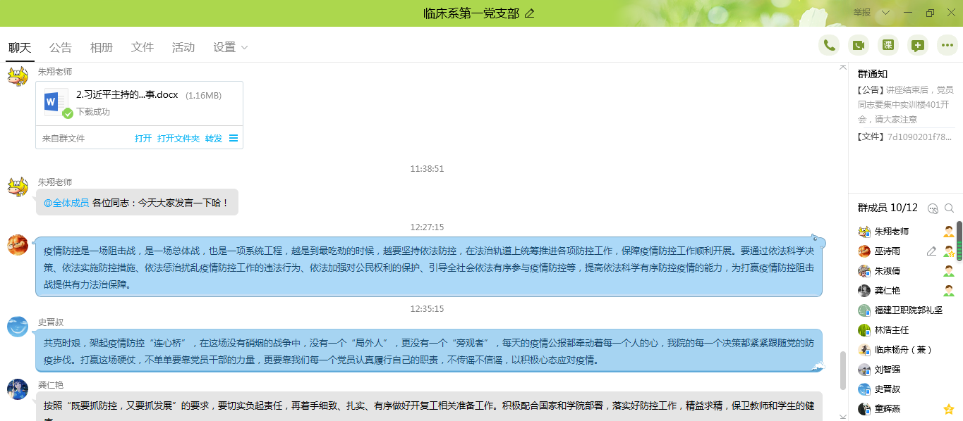 經(jīng)過(guò)認(rèn)真學(xué)習(xí),同志們積極踴躍參與討論,交流學(xué)習(xí)心得。共克時(shí)艱,架起疫情防控“連心橋”,在這場(chǎng)沒有硝煙的戰(zhàn)爭(zhēng)中,沒有一個(gè)“局外人”,更沒有一個(gè)“旁觀者”,每天的疫情公報(bào)都牽動(dòng)著每一個(gè)人的心,學(xué)校的每一個(gè)決策都緊緊跟隨黨的防疫步伐。打贏這場(chǎng)硬仗,不單單要靠黨員干部的力量,更要靠我們每一個(gè)黨員認(rèn)真履行自己的職責(zé),不傳謠不信謠,以積極心態(tài)應(yīng)對(duì)疫情。按照“既要抓防控,又要抓發(fā)展”的要求,要切實(shí)負(fù)起責(zé)任,再著手細(xì)致、扎實(shí)、有序做好開復(fù)工相關(guān)準(zhǔn)備工作。積極配合學(xué)校部署,落實(shí)好防控工作,精益求精,保衛(wèi)教師和學(xué)生的健康。