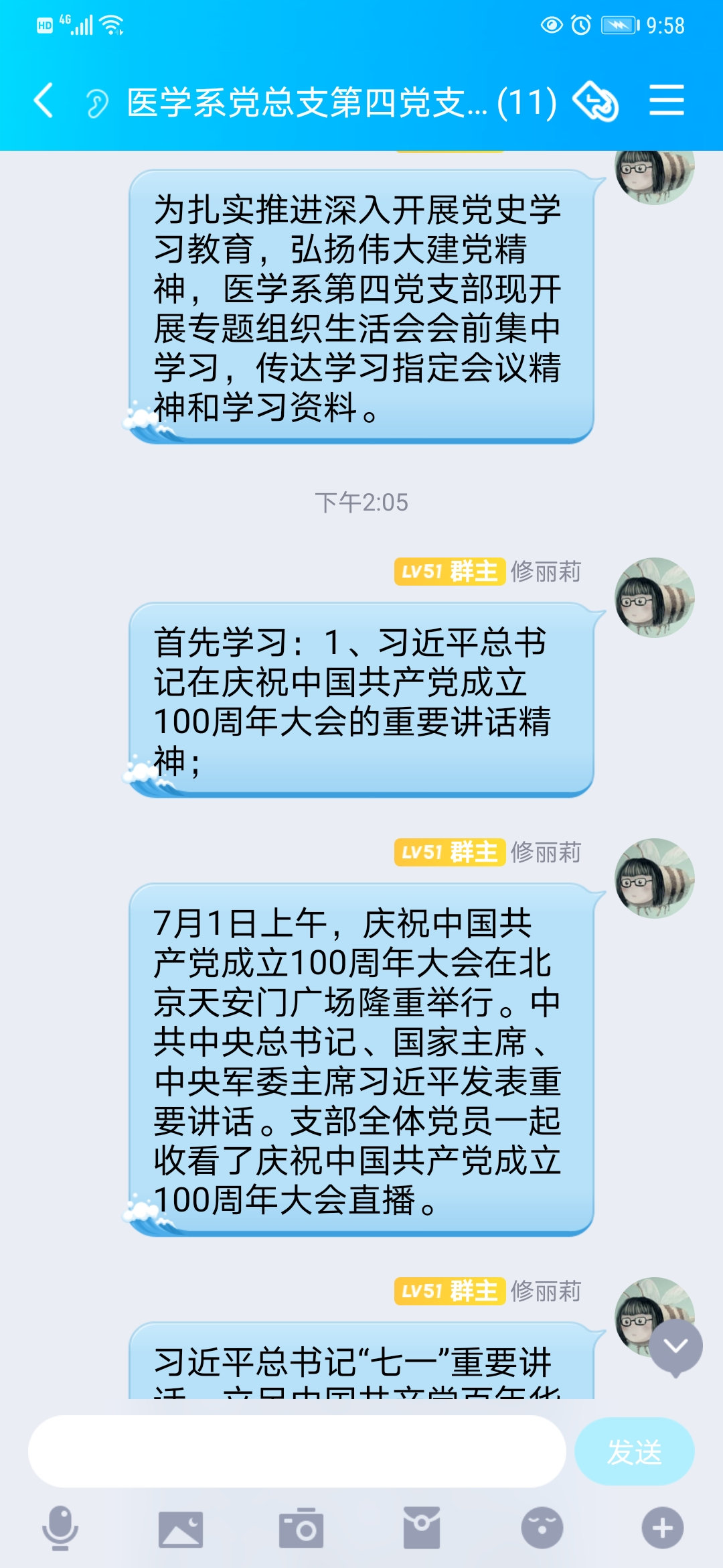 為扎實推進深入開展黨史學習教育,弘揚偉大建黨精神,2021年8月19日,醫(yī)學系第四黨支部在線開展黨史學習教育專題組織生活會會前集中學習。支部副書記修麗莉帶領(lǐng)大家學習習近平總書記在慶祝中國共產(chǎn)黨成立100周年大會上的重要講話精神。全體黨員圍繞習近平總書記的重要講話發(fā)表了學習體會。