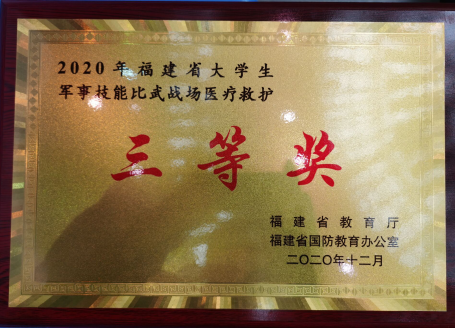 12月25日-27日由福建省教育廳、福建省國防教育辦公室主辦,福建醫(yī)科大學承辦的2020年福建省大學生軍事技能比武競賽在福建醫(yī)科大學舉行。由醫(yī)學系8名學生組成的福建衛(wèi)生職業(yè)技術學院代表隊參加了戰(zhàn)場醫(yī)療救護和手榴彈定點投擲兩個項目,并獲得“2020年福建省大學生軍事技能比武戰(zhàn)場醫(yī)療救護”三等獎。