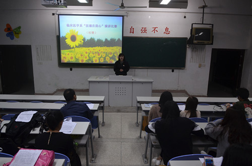 為踐行“業(yè)精德誠”的校訓(xùn)精神,展現(xiàn)良好的醫(yī)德醫(yī)風(fēng),臨床醫(yī)學(xué)系團(tuán)總支于2016年4月14日晚開展了“醫(yī)德在我心,醫(yī)術(shù)任我行”演講大賽。評委由兩委會各成員組成,葉家濤老師到場指導(dǎo)。