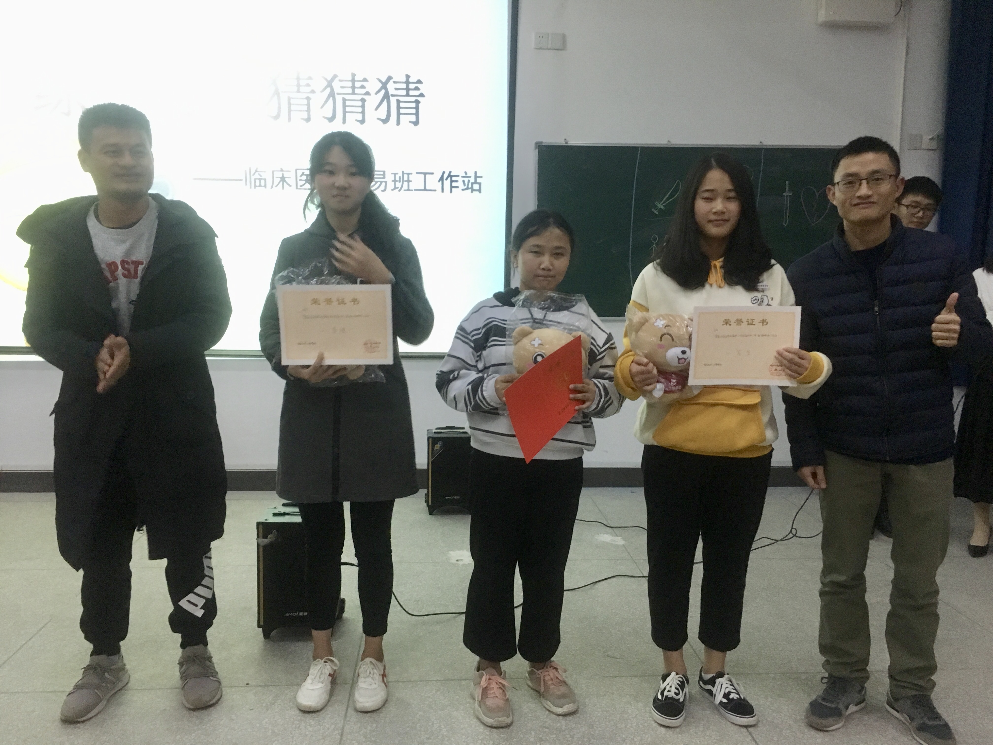 綜“易”猜猜猜活動(dòng)在臨床系舞蹈隊(duì)充滿活力的舞蹈中展開了。第一輪“看歌詞猜歌名”的淘汰賽;每組選手依次答題,不僅選手們努力答題,老師和在場觀眾也絞盡腦汁參與其中。第二輪“聽伴奏猜歌名”選手們更是踴躍舉手搶答,熱情高漲。在此輪比賽晉級(jí)的小組進(jìn)入到最后的“你畫我猜歌名”環(huán)節(jié),選手們各式各樣的畫風(fēng)以及奇特的回答方式讓全場的氛圍十分歡樂,老師和兩委會(huì)的成員們也大顯身手。比賽最后,18針推302贏得了本次比賽的第一名,活動(dòng)圓滿結(jié)束。
