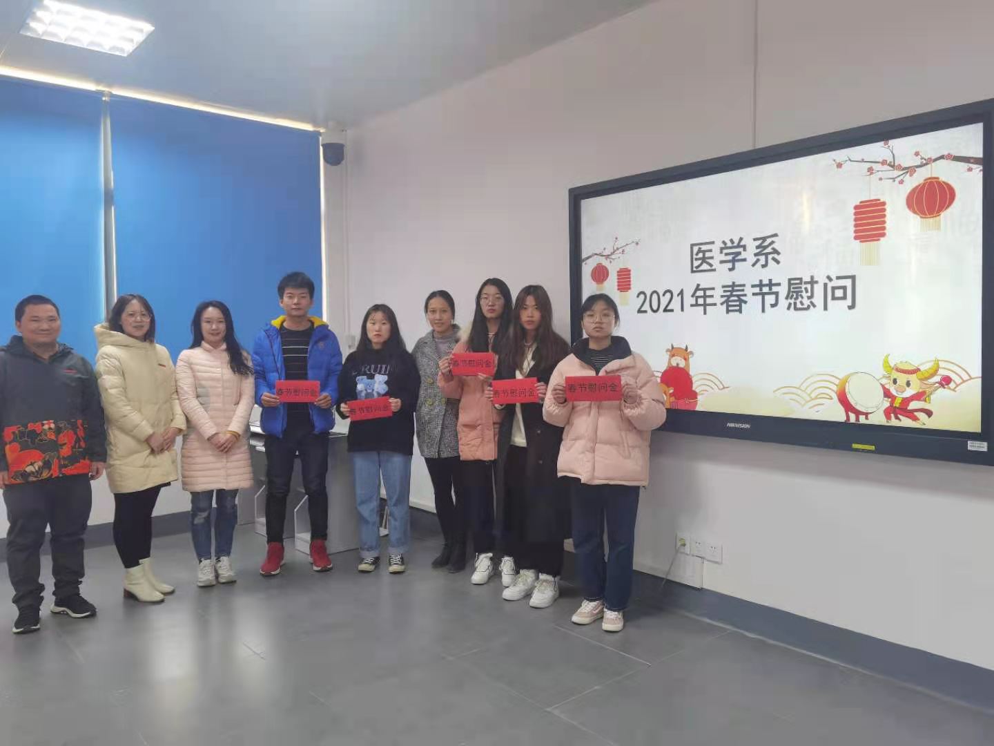 佳節(jié)將至,歲寒情深,為了讓孩子們感受來自學校、系部的深切關愛,度過一個溫馨祥和的春節(jié),醫(yī)學系于2021年1月12日下午在實訓樓311開展2021年春節(jié)慰問活動。醫(yī)學系黨總支副書記陳潔、20級慰問學生代表及輔導員一同參加了活動。
