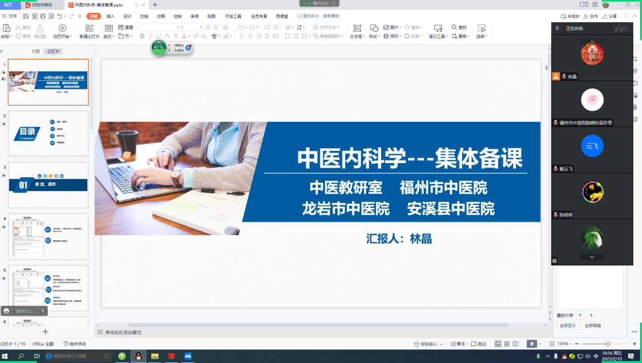 為搭建校內(nèi)校企橋梁,嚴把教學(xué)質(zhì)量關(guān),共同提升教學(xué)質(zhì)量,做好同質(zhì)化管理,2023年2月10日晚7點,根據(jù)中醫(yī)學(xué)、針灸推拿學(xué)專業(yè)本學(xué)期課程內(nèi)容,由中醫(yī)教研室牽頭,對《中醫(yī)內(nèi)科學(xué)》、《中醫(yī)外科學(xué)》、《中醫(yī)婦科學(xué)》、《中醫(yī)兒科學(xué)》、《針灸學(xué)》、《急救醫(yī)學(xué)》幾門課程開展集體線上集體備課,由各課程負責人主備,聯(lián)同福州市中醫(yī)院、龍巖市中醫(yī)院、安溪縣中醫(yī)院三所校企合作單位,分為6個分會場,在騰訊會議中開展了集體備課。會議中依托執(zhí)業(yè)助理醫(yī)師考試大綱,主要針對教材、教案、課件、進程表、教學(xué)方法、考核方式等內(nèi)容進行交流討論。校企醫(yī)院的教師代表針對以上問題進行深入探討,積極提問并發(fā)表意見,最終各門課程進程表將逐步優(yōu)化,提高了對教學(xué)材料的規(guī)范性認識,對課程內(nèi)容、教學(xué)方法以及思政育人目標有了進一步認識。