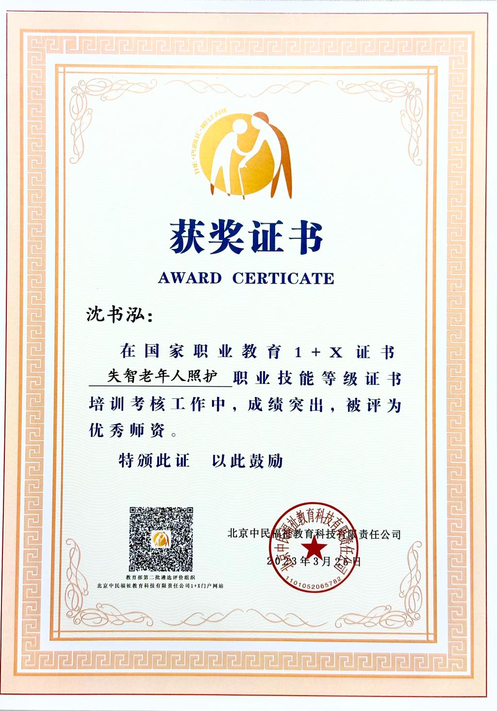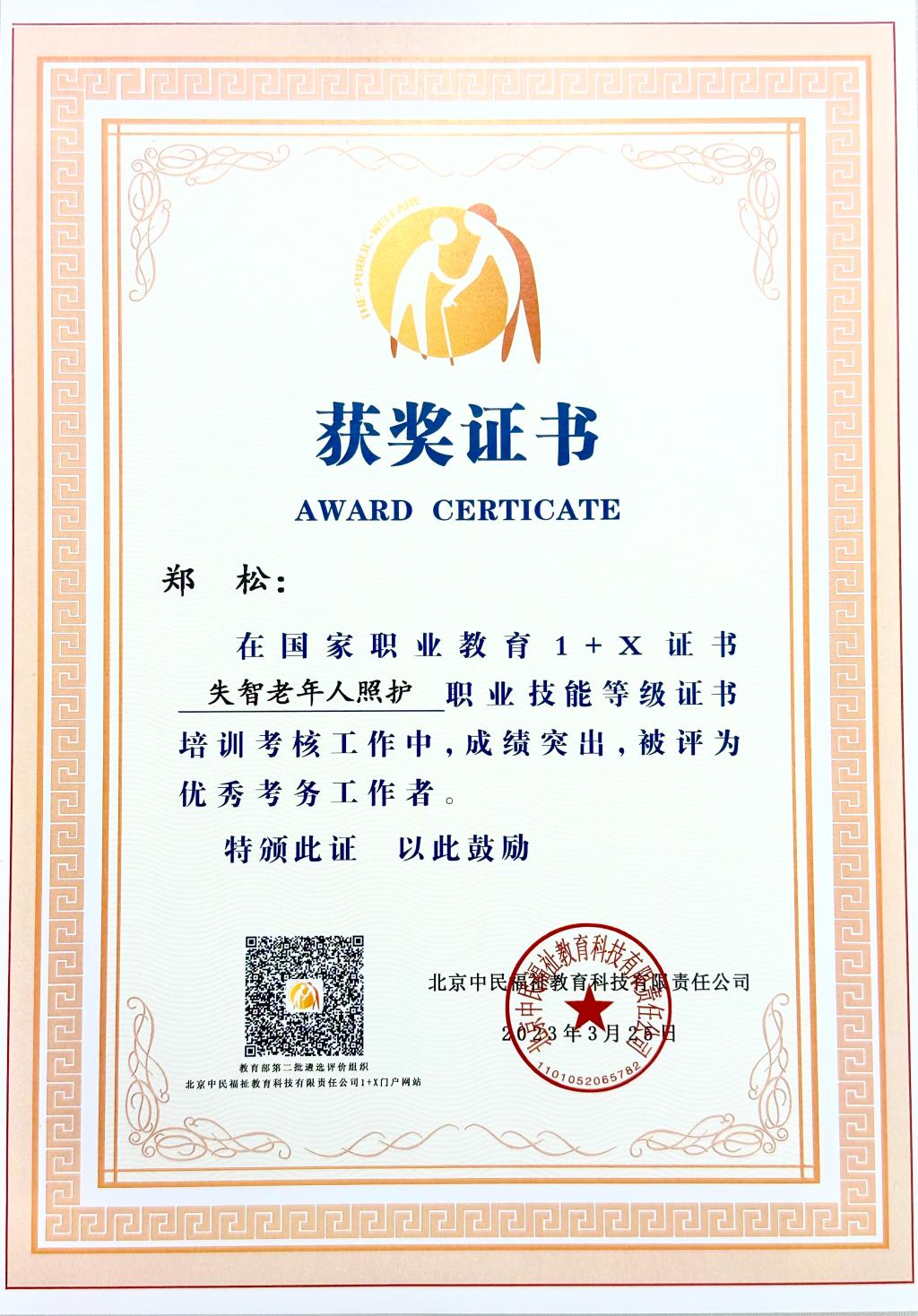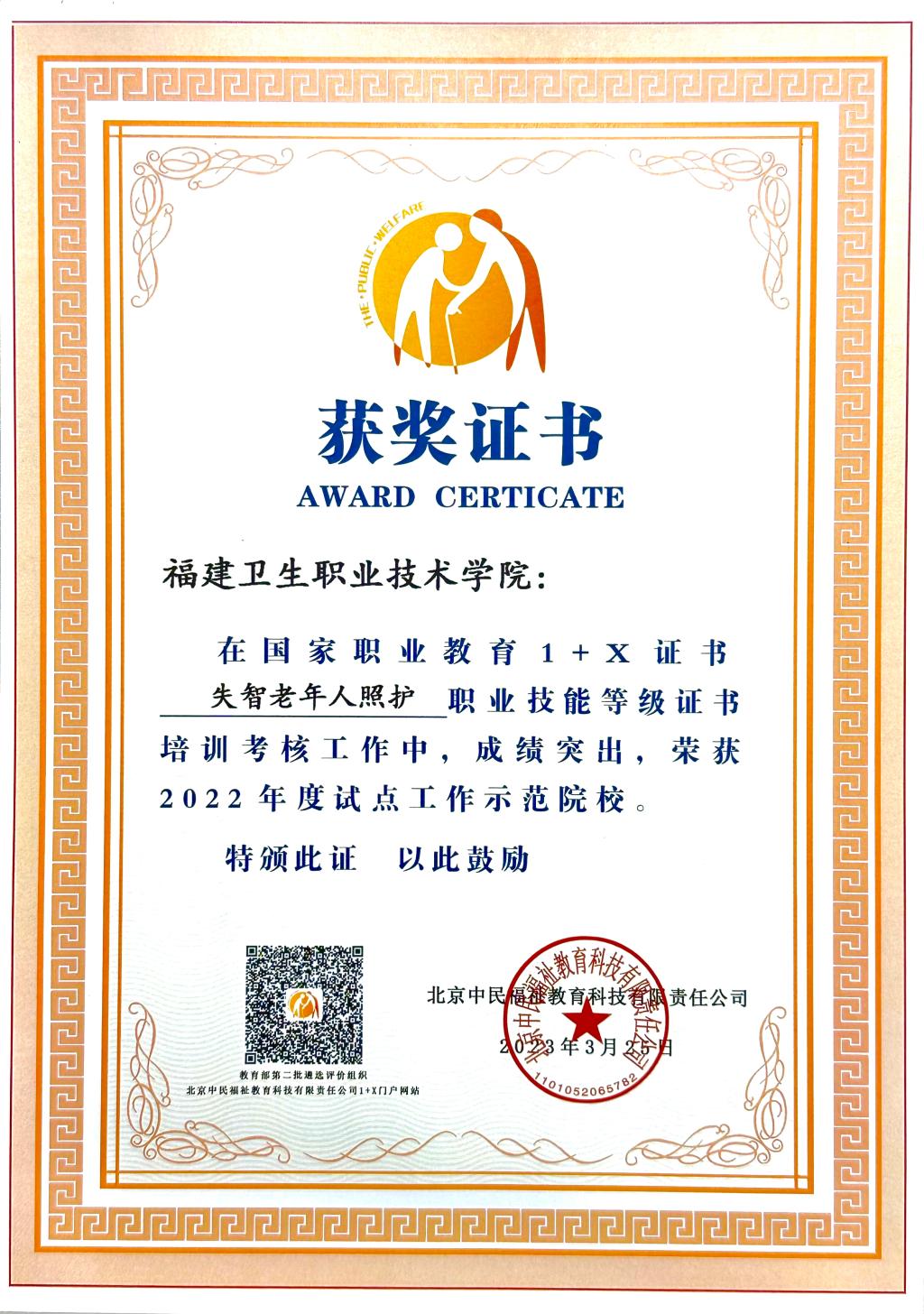 3月25日,在北京召開全國(guó)社會(huì)福祉領(lǐng)域1+X證書工作總結(jié)表彰暨2023年工作動(dòng)員會(huì),來自全國(guó)60余所院校、15個(gè)行業(yè)企業(yè)共200余人參加會(huì)議。我校被授予國(guó)家職業(yè)教育1+X證書《失智老年人照護(hù)》職業(yè)技能等級(jí)證書培訓(xùn)考核工作“2022年度試點(diǎn)工作示范院?!睒s譽(yù)稱號(hào),醫(yī)學(xué)院康復(fù)治療技術(shù)專業(yè)老師鄭松獲”優(yōu)秀考務(wù)工作者“、沈書泓獲”優(yōu)秀師資“榮譽(yù)稱號(hào)。