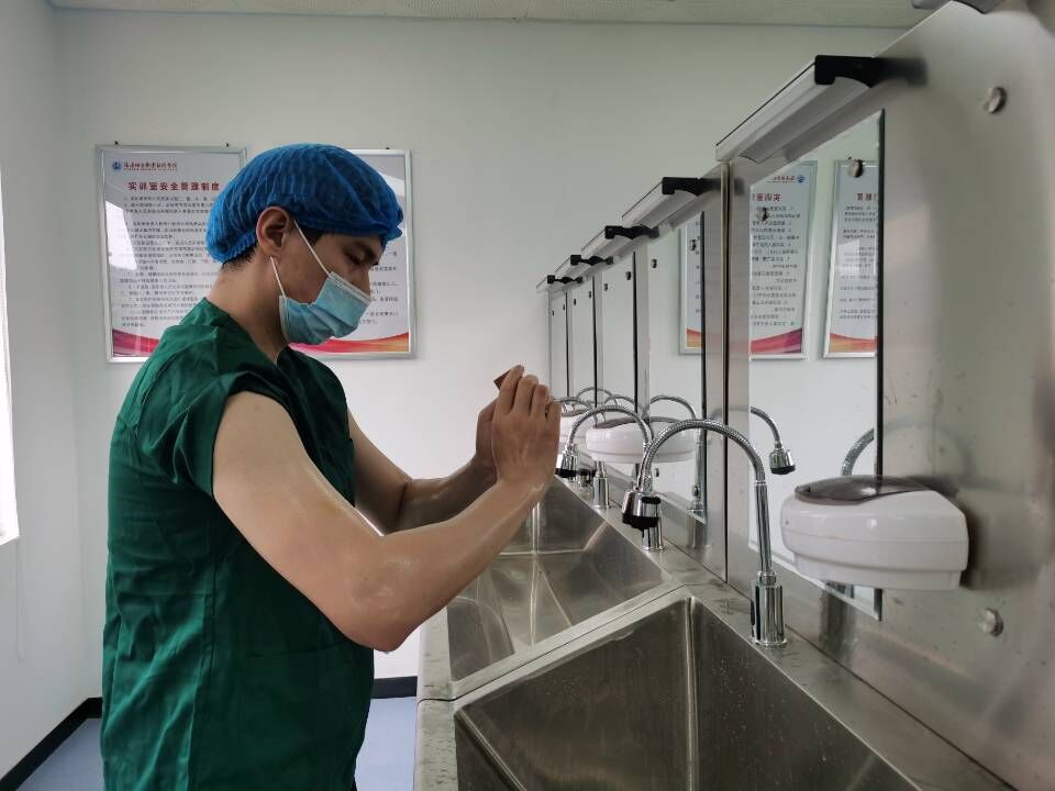 此次活動由劉景城老師主講,首先她根據(jù)教學(xué)目標、臨床執(zhí)業(yè)助理醫(yī)師考試要求、臨床實踐操作要求,并參照《醫(yī)師資格考試大綱》(2019年版),將手術(shù)刷手法進行了分步驟講解,并對強調(diào)操作過程的注意事項;隨后由劉智強老師指導(dǎo),黃騰斌老師在新實訓(xùn)樓模擬手術(shù)室內(nèi)演示臨床外科常用手術(shù)刷手法操作流程。操作結(jié)束后,各位老師就傳統(tǒng)的肥皂水刷手法的沿用和演變、目前臨床上手術(shù)刷手的新方法、不同刷手方法的組合選擇以及手術(shù)刷手法的基本原則等問題就操進行深入探討,大家積極發(fā)表意見,總結(jié)出較為合理的操作方法,改進與完善實訓(xùn)課教學(xué),以提高學(xué)生的臨床實踐操作技能。