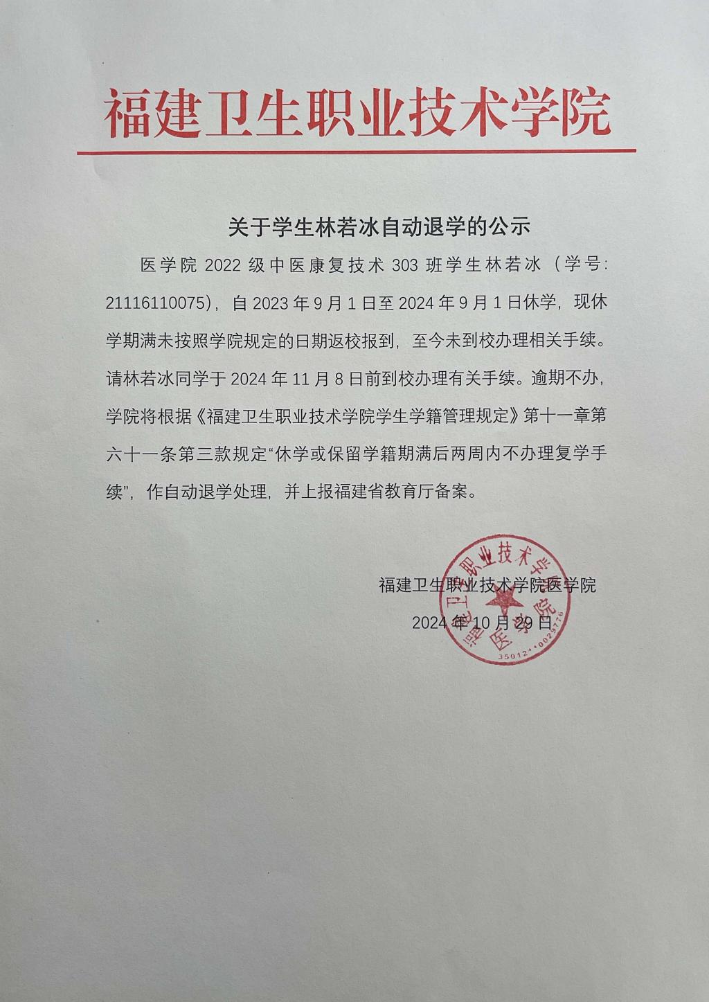 關(guān)于學(xué)生林若冰自動(dòng)退學(xué)的公示