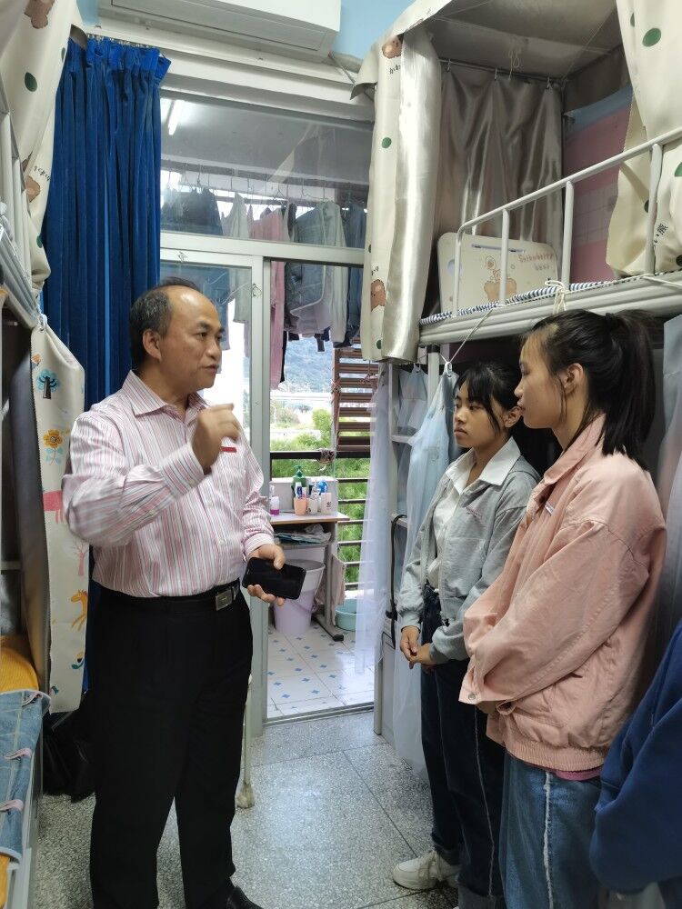 會后,許能鋒還走訪了學生宿舍,仔細查看了宿舍的硬件設施、環(huán)境衛(wèi)生、消防安全等情況,與同學們親切交流,深入了解學生的生活情況。他對宿舍的學習氛圍及衛(wèi)生情況給予了肯定,并叮囑大家要保持環(huán)境衛(wèi)生,注意安全用電,并表示會常到學生中走走,做同學們的良師益友。