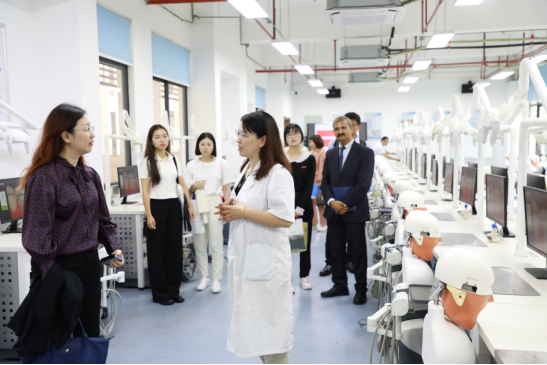 來訪期間,蔡寶珠一行在我校領(lǐng)導的陪同下參觀了醫(yī)學院現(xiàn)代康復實訓中心、針灸推拿實訓中心、口腔醫(yī)學專業(yè)實訓中心。在參觀過程中,代表團首先聽取了醫(yī)學院對實訓室建設(shè)情況的詳細介紹。醫(yī)學院詳細介紹了實訓室的規(guī)模、設(shè)施配備以及在教學實踐中的應(yīng)用情況,并強調(diào)了實訓室在培養(yǎng)學生實際操作能力和臨床技能方面的重要作用。同時,也展示了近年來學院在實訓室建設(shè)和醫(yī)學實踐教育方面所取得的成果。