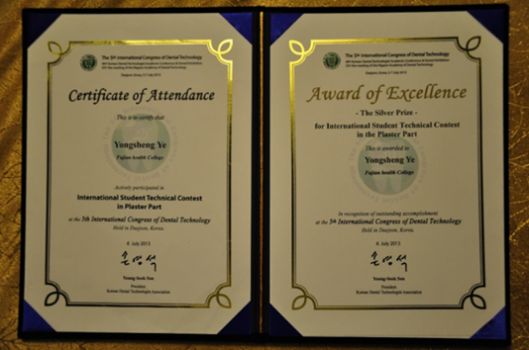 學生第五屆國際口腔技師學術大會(韓國)口腔醫(yī)學技術專業(yè)石膏牙雕刻銀獎