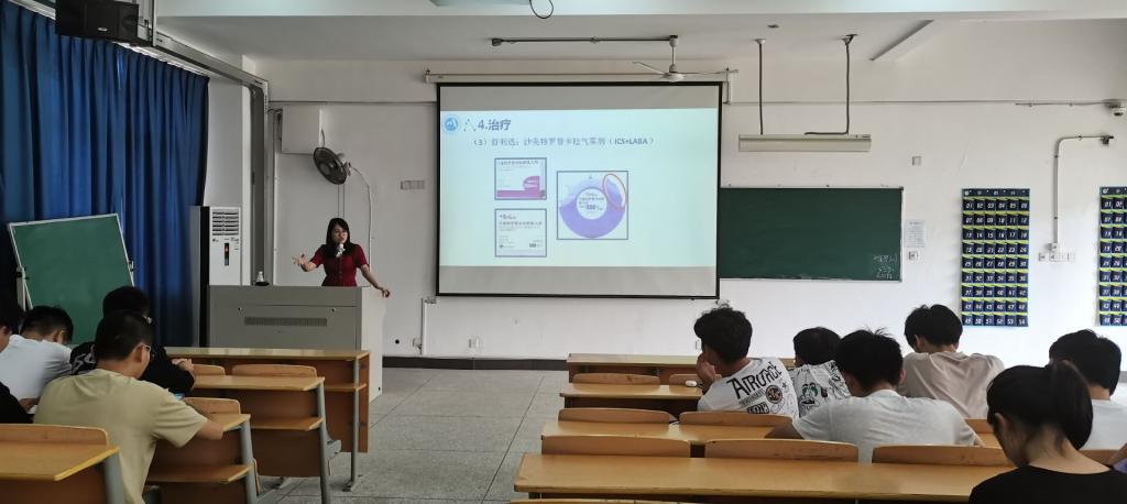 彭小蕊老師分別從哮喘的流行病學(xué)特征、病因、臨床表現(xiàn)、治療及預(yù)后五個(gè)方面由淺入深為本系一年級(jí)學(xué)生講述哮喘疾病的典型臨床特征,講解過(guò)程中,結(jié)合臨床實(shí)際案例、影視劇人物的哮喘典型發(fā)作等多種形式形象的展示哮喘急性發(fā)作臨床表現(xiàn),吸引了在場(chǎng)學(xué)生極大興趣,現(xiàn)場(chǎng)氣氛活躍。隨后,結(jié)合操作圖解、實(shí)物講解及操作視頻為在場(chǎng)學(xué)生科普了哮喘常見(jiàn)吸入治療藥物,包括萬(wàn)托林、信必可都寶、舒利迭等藥物的使用方法,并重點(diǎn)講解使用過(guò)程中的注意事項(xiàng),不斷引導(dǎo)學(xué)生今后從業(yè)過(guò)程中要注意用藥并發(fā)癥、做好病人用藥指導(dǎo)。