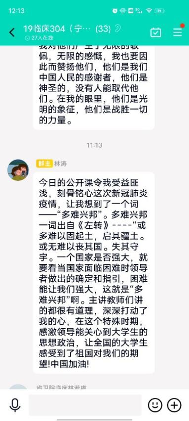 各教研室老師在觀看后在線進(jìn)行了充分交流。這個(gè)時(shí)期展開這門思政大課,讓我們能從這次疫情中不斷學(xué)習(xí)和反思,針砭總結(jié),弘揚(yáng)團(tuán)結(jié)奉獻(xiàn)之風(fēng)。通過疫情防控思政大課的學(xué)習(xí),深刻認(rèn)識到作為一名中共黨員,應(yīng)充分發(fā)揮先鋒模范作用,不信謠,不傳謠,全力以赴、科學(xué)有效做好疫情防控工作。我們要做好自身的疫情防控,同時(shí)也要關(guān)心在疫情期間的學(xué)生的學(xué)習(xí)生活和心理健康。值此疫情防控關(guān)鍵時(shí)期,為人師者必應(yīng)以最好狀態(tài)投入到抗疫戰(zhàn)斗、堅(jiān)守教學(xué)崗位,并于教學(xué)中加強(qiáng)思政引導(dǎo),與校與生共渡磨難。