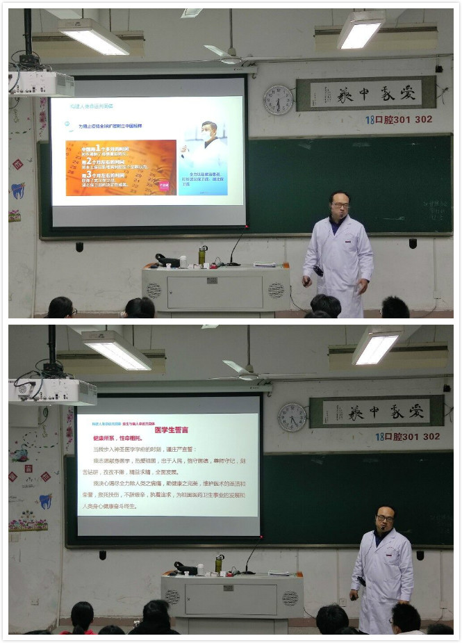 林國威副主任從為阻止疫情全球擴散樹立中國榜樣介紹起,分四個方面展開:人與自然,構(gòu)成命運共同體、國與國,構(gòu)成人類命運共同體、科學家與科學家,構(gòu)成科技命運共同體以及醫(yī)生與病人命運共同體、教師與學生命運共同體;帶領(lǐng)同學們重溫了醫(yī)學上誓言,讓同學們深刻領(lǐng)會了決定你人生高度的,其實是你的學習力。