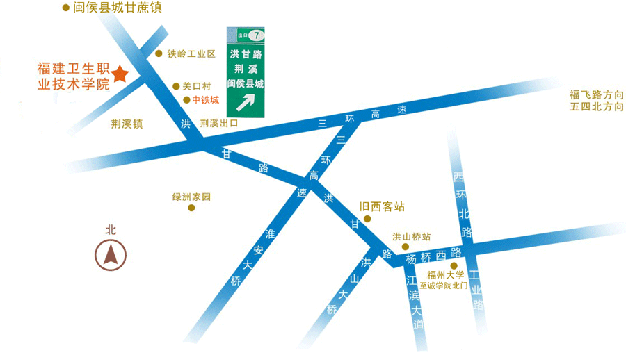 5.自駕車路線:①從三環(huán)路往南平、閩侯方向到荊溪出口(閩侯縣城、洪甘路)下,右轉(zhuǎn)沿洪甘路朝閩侯縣城方向約3.5公里至福建衛(wèi)生職業(yè)技術(shù)學院。②從福銀高速閩侯竹岐出口下,右轉(zhuǎn)(向西)過閩侯大橋,沿福州方向路標至福建衛(wèi)生職業(yè)技術(shù)學院(閩侯大橋至我院約9公里)。
